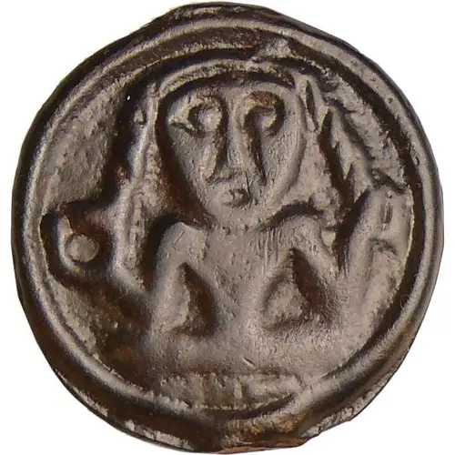 | Obverse description | Figure facing forward, seated cross-legged, hair separated into two side braids, holding a torque in his right hand and one of his braids in the other; peripheral bead. |