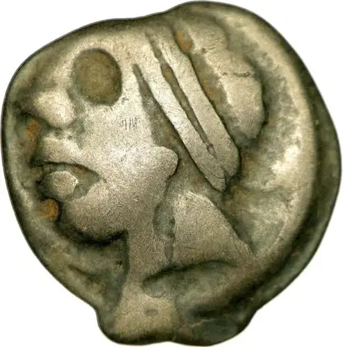 | Description de l’avers | Small helmeted head (neck visible) on the left, with a double parallel headband; empty eye and globule in the mouth. |