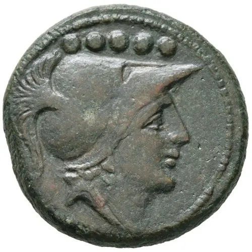 | Descrizione del dritto | Head of Athena to right, wearing crested Corinthian helmet; above, five pellets (mark of value). |