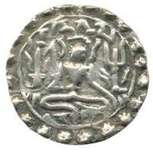 | Описание аверса | Avalokiteshwara `Manjushri`, seated cross-legged on lotus, holding sword, flanked by flaming Trisula and sword; brahmi legend Ratnattraya above |