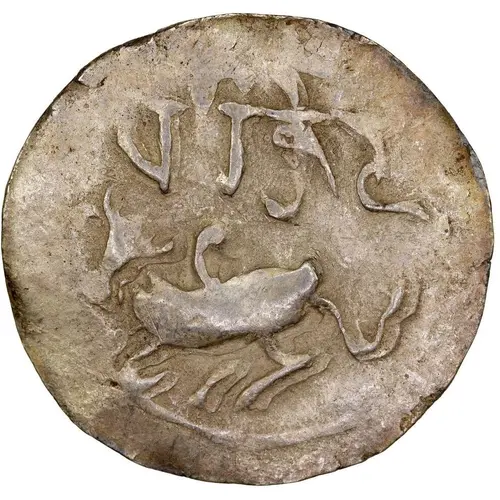توضیحات روی سکه Bull, stylized, with calligraphic lettering and conch on right.