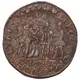 King Philip II of Spain enraged upon learning of Jáuregui`s failed assassination attempt, doom raining down on him from heaven, two of his vassals standing on right, date in exergue. |