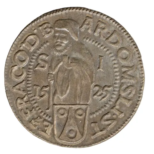 | Description de l’avers | St Joachim as pilgrim dividing the letters S I (for St Ioachim) and the date, above composite arms |