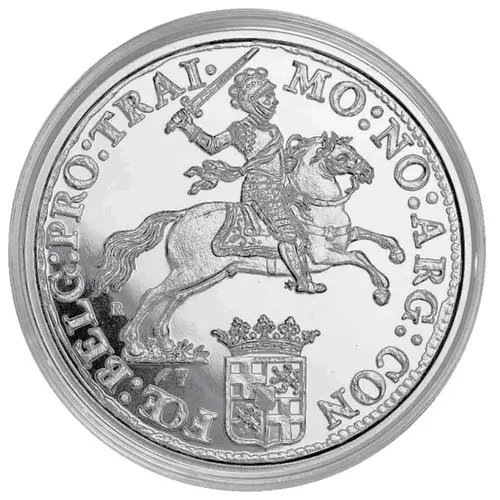 | توضیحات روی توکن | Mounted knight with raised sword restrike mark at left R and mintmarks below, Raven (Bert van Ravenswaaij) and caduceus ☤ (Utrech). |