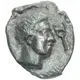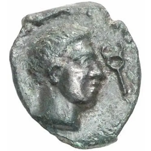 Descrição do anverso Youth`s head right, in front of kerykeion.