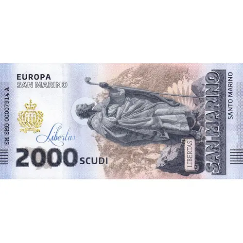 2000 SCUDI QUESTA BANCONOTA NON HA CORSO LEGALE MA È UN OGGETTO DA COLLEZIONE UFFICIALE E UN TRIBUTO ALLA PIÙ ANTICA REPUBBLICA DEL MUNDO, SAN MARINO. Libertas EUROPA (Translation: 2000 SCUDI THIS BANKNOTE IS NOT LEGAL TENDER BUT IS AN OFFICIAL COLLECTOR`S ITEM AND A TRIBUTE TO THE WORLD`S OLDEST REPUBLIC, SAN MARINO. FREEDOM EUROPE) |