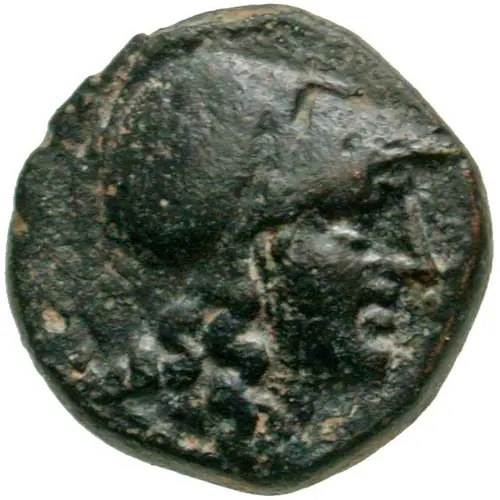 Descrição do anverso Head of Minerva right, wearing crested Attic helmet.