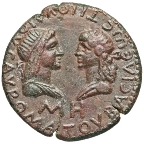| Obverse description | Confronted busts of Sauromates I on left, diademed and draped, and Aphrodite Apatura on right, draped. |