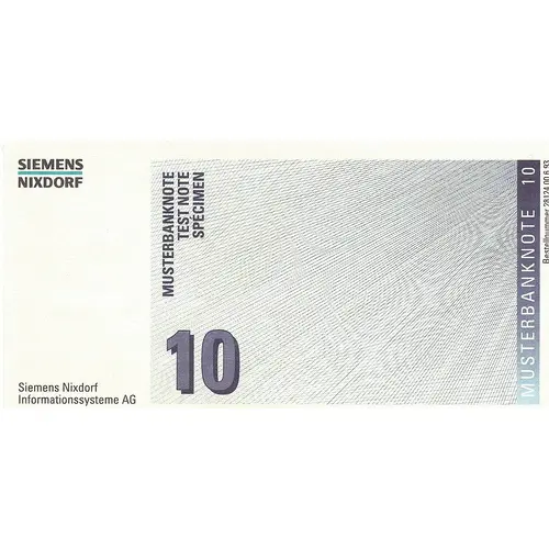 | Vorderseitenlegende | MUSTERBANKNOTE TEST NOTE SPECIMEN Siemens Nixdorf Informationssysteme AG |