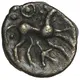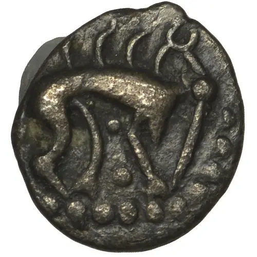| Reversbeschreibung | Horse right, solid head, reign from chest to nose. `Stickman` below. Pellet triad either side of pellet in ring above. |