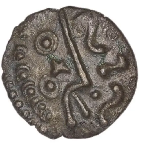 | توضیحات پشت سکه | Triple-tailed annulate horse left. Pellet in ring and three-petal flower motif below. Cross and winged pellet in ring motif above (very stylised bird head with X below). One pellet above tail. |