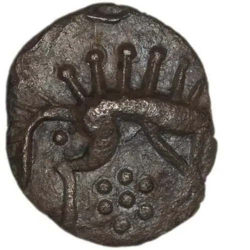 | Mô tả mặt sau | Horse right, large open head. Wheel above. Pellet rosette below. |