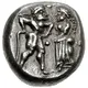 | Obverse description | Ithyphallic satyr standing right, hands placed on hips, confronting nymph standing right, raising right hand in protest, her left hand placed forward in a plea-like gesture; three pellets around. |
