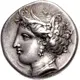 | Obverse description | Head of Persephone left, wearing wreath of grain ears, triple-pendant earring, and pearl necklace |