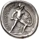 | Reverse description | Ajax, nude but for crested Corinthian helmet, holding sword in right hand, shield decorated with palmette and griffin on left arm, advancing right on rocks; OΠONTIΩN to left, laurel branch and spear below |