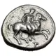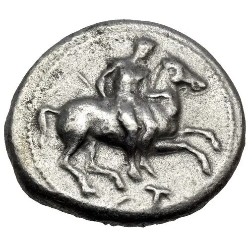 | Ön yüz açıklaması | Nude youth, holding whip in right hand, dismounting from horse rearing right; below, T. |