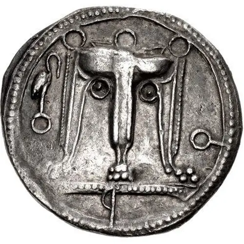 Beschrijving keerzijde Incuse tripod as obverse, but wreaths in relief.
