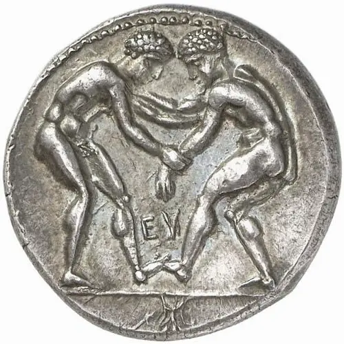 Mô tả mặt trước Two nude wrestlers grappling with each other, between them, ΕΥ and in exergue, palmette