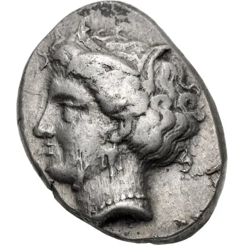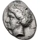| Popis líce | Head of female (Persephone?) left, wearing wreath of grain ears, triple-pendant earring, and pearl necklace. |