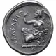 توضیحات پشت سکه Nike, nude to the waist, wearing necklace with circular pendant, kneeling to left on club, raising right hand to inscribe city`s name; below club, ΣΙ (retrograde).