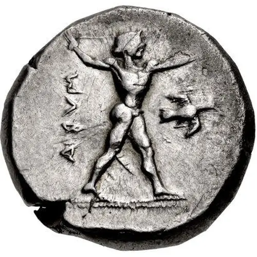 | توضیحات روی سکه | Poseidon, nude, in throwing stance right, holding trident overhead in right hand; retrograde ABVM downward to left; to right, bird flying right. |
