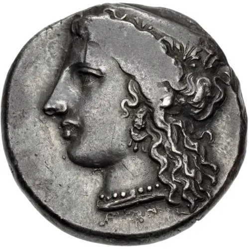 | Popis líce | Head of Hera left, wearing stephanos decorated with palmettes, ornate earring with upward crescent and three drops, and pearl necklace. |