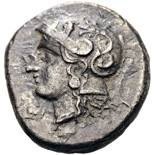 | Popis líce | Head of Athena to left, wearing a crested Attic helmet adorned with two olive leaves on the visor and a palmette on a tendril on the bowl |