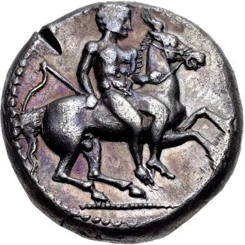 | Descripción del anverso | Nude youth, holding whip, dismounting from horse rearing right. |