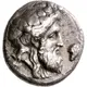 | Beschrijving voorzijde | Bearded head of Dionysos facing right, wearing a wreath of vine leaves. To his right, a bunch of grapes. |