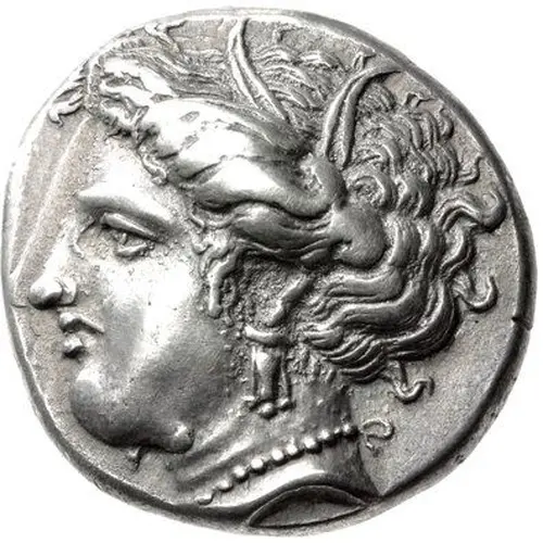 | Descrição do anverso | Wreathed head of Persephone left. |
