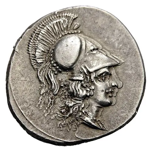 Obverse description Head of Athena facing to right, wearing crested Corinthian helmet
