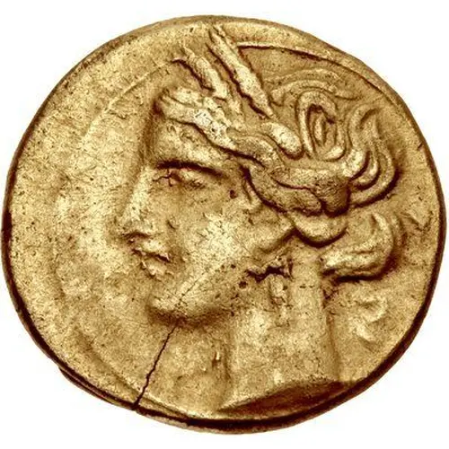 | توضیحات روی سکه | Head of Tanit left, wreathed with corn, wearing single-drop ear-ring. |