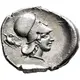 Head of Athena to right, wearing Corinthian helmet; behind neck guard, dove flying left.
