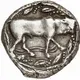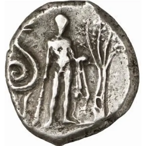 | Descrição do anverso | Herakles standing facing, holding club and bow, lion skin over arm; to left, serpent coiled right; tree of the Hesperides to right. |