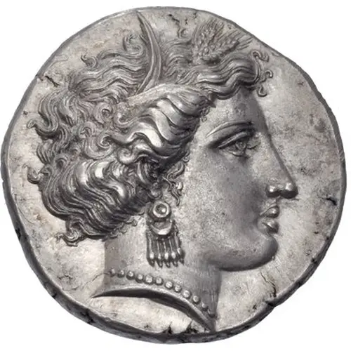 | Obverse description | Head of Demeter facing right, wearing a grain wreath, an elaborate disc and a crescent earring with pendants, and a pearl necklace |