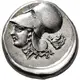 | Mô tả mặt sau | Head of Athena to left, wearing Corinthian helmet; behind neck guard, forepart of a griffin flying left. |