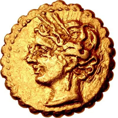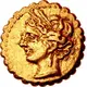 | Descrição do anverso | Head of Tanit left, wearing wreath of grain ears, single-pendant earring, and necklace. |