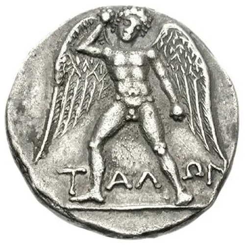 | Descrição do anverso | Talos, nude, standing facing, wings spread, hurling stone in his right hand, holding another in his left |