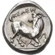 | Descripción del anverso | Nude youth, holding whip in his right hand and the reins in his left, seated sideways on horse rearing to right, preparing to slide off and run alongside as part of a race. |