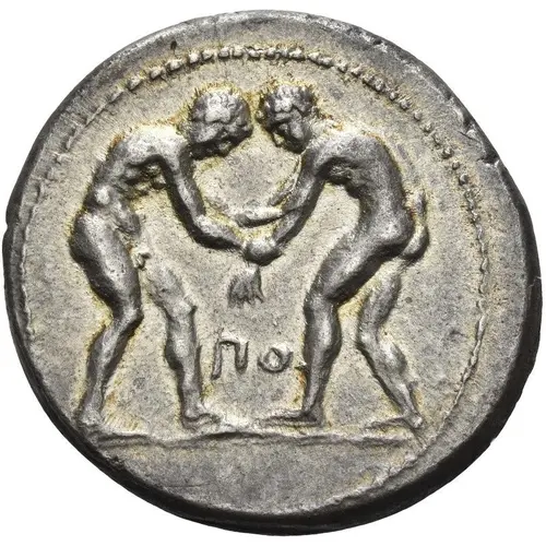 | Aversbeschreibung | Two wrestlers beginning to grapple with each other. Between them, ΠO. |