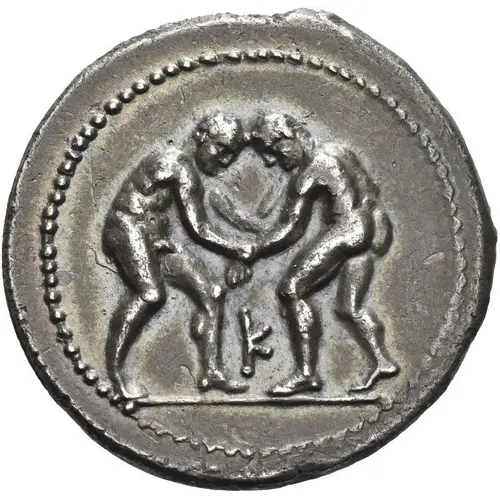 | Aversbeschreibung | Two wrestlers beginning to grapple with each other and between them the letter K. |