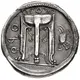 | Mô tả mặt sau | Incuse tripod as obverse, but wreaths and lower serpents relief, no serpents rising from the bowl; (retrograde P (koppa) to left, outline of crab to right, zig-zag line in exergue, radiate border. |