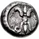 | Descrizione del rovescio | Vertical thunderbolt with wings above and volutes below, A F flanking and all within incuse circle |