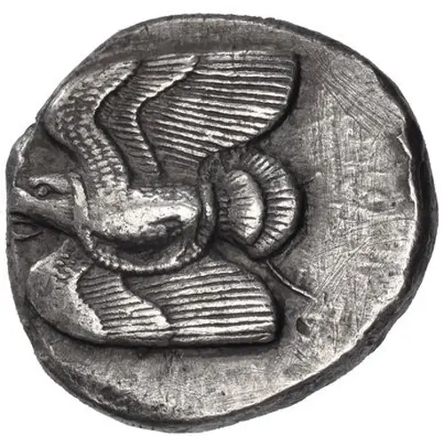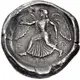 | Reversbeschreibung | Nike running to left, wearing a diadem and a chiton and with open wings, holding a wreath in her outstretched right hand and holding the hem of her chiton with her left and all within a circular incuse |