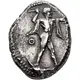 | Descrição do anverso | Poseidon striding to right, his left arm outstretched, brandishing trident with his right hand and with chlamys draped over his shoulders; in field to left, Θ. |