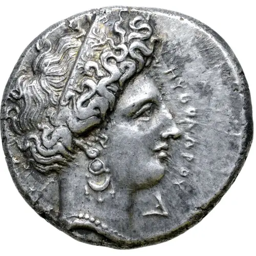 | Descripción del anverso | Head of Artemis Aptera to right, with hair elaborately curled upwards around a stephane ornamented with palmettes; she wears an elaborate crescent and solar-disk pendant earring with three drops and a pearl necklace; to right in smaller letters the artist`s signature. |