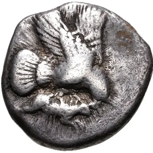 Obverse description Eagle flying right, grasping hare with talons and beak