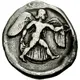 | 裏面の説明 | Nike striding right, holding wreath and hem of her dress, within circular incuse |