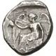 | 裏面の説明 | Nike wearing long chiton seated left on square cippus, extending her right arm to touch a lion`s head fountain, left hand on seat behind her. |
