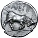 | Reverse description | Bull butting to right on wavy exergual line. |